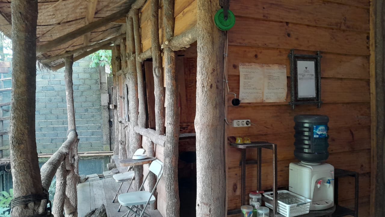 Kamar rumah pohon ini berada di lantai atas dan menawarkan suasana alami yang hangat dengan interior serba kayu. Dua tempat tidur terletak berdampingan, masing-masing dilengkapi selimut bermotif cerah yang menambah kesan nyaman. Ruangan memiliki jendela kayu besar yang dapat dibuka lebar, memberikan pencahayaan alami yang melimpah serta sirkulasi udara yang segar. Dari jendela dan pintu, tamu dapat menikmati pemandangan pegunungan Dieng yang sejuk, menciptakan pengalaman menginap yang tenang dan menenangkan. Perabotan di dalam kamar, seperti meja kecil dari kayu alami, memperkuat nuansa rustic khas rumah pohon. Kamar ini sangat cocok bagi tamu yang mencari ketenangan dan kedekatan dengan alam.
