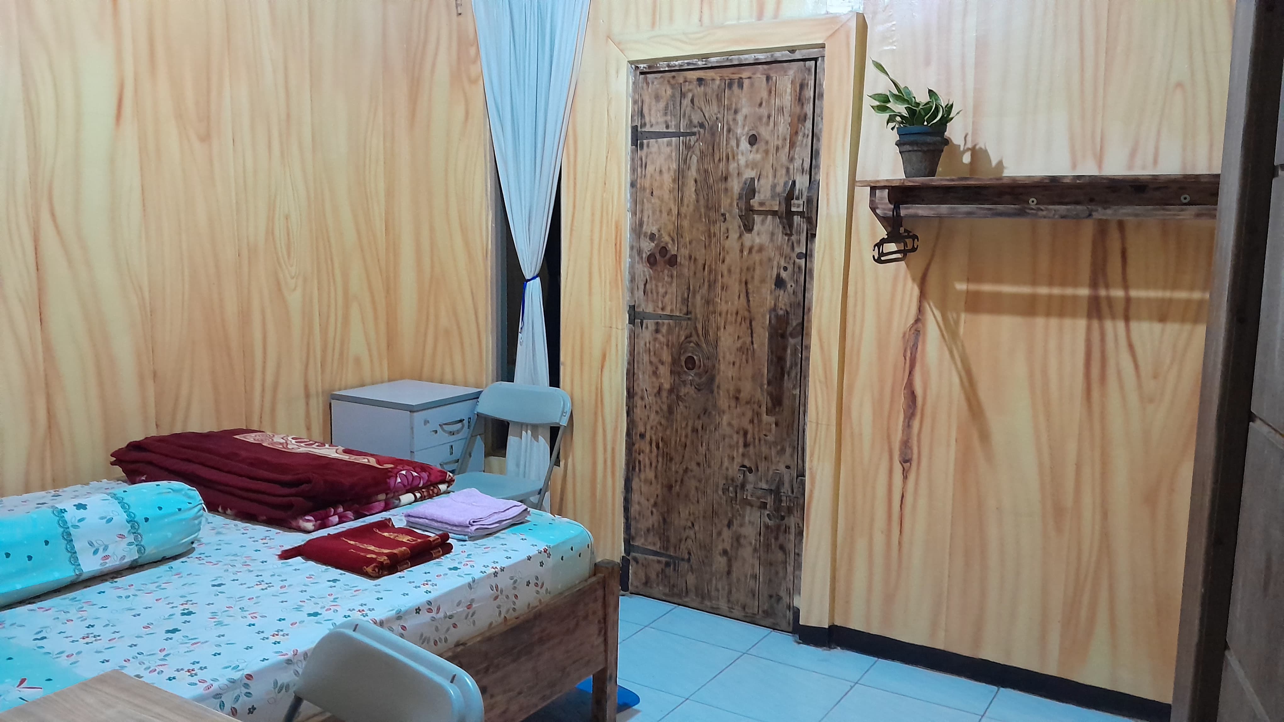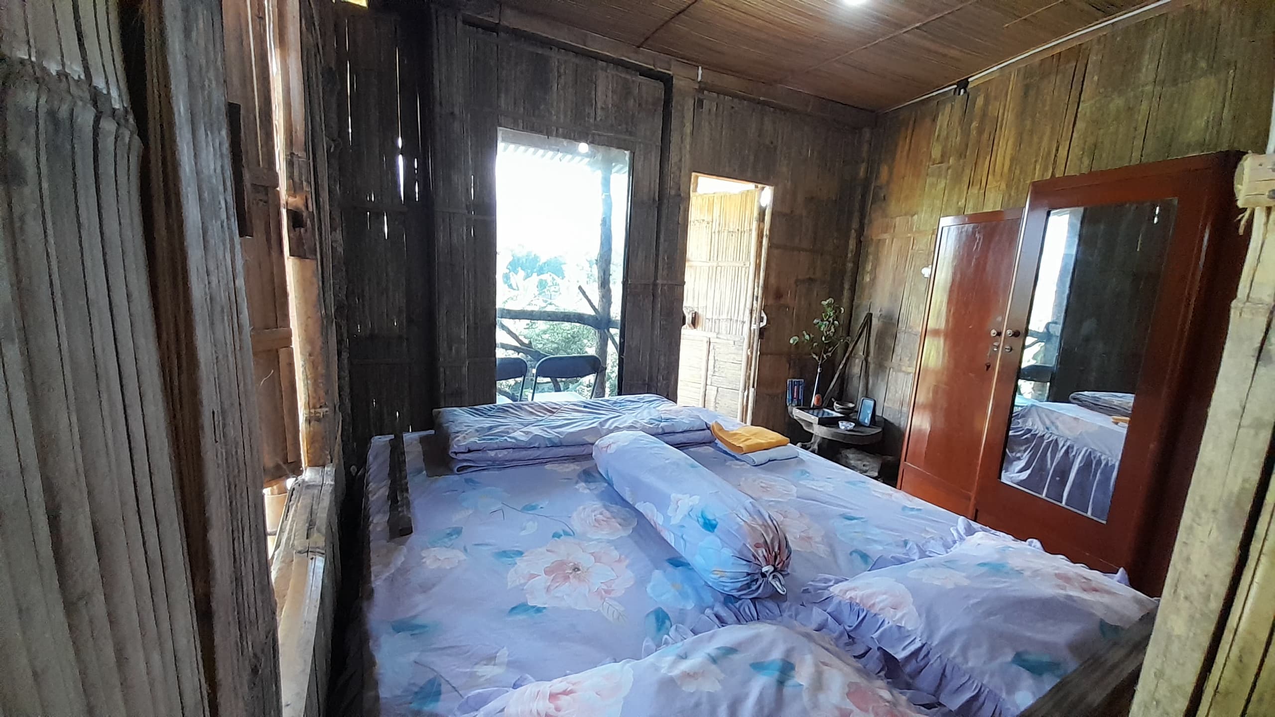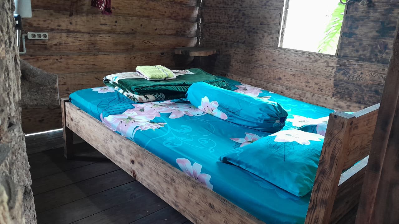 Kamar rumah pohon ini terletak di lantai atas dan menghadirkan suasana alami yang hangat melalui dominasi material kayu di seluruh ruangan. Dilengkapi dengan satu tempat tidur berdesain kayu yang kokoh serta sprei bermotif bunga yang cerah, kamar ini memberikan kenyamanan sederhana namun menyenangkan. Di atas tempat tidur telah disediakan selimut dan handuk, siap untuk digunakan tamu. Jendela kayu yang terbuka memungkinkan cahaya alami masuk dengan lembut, sekaligus menawarkan pemandangan langsung menuju pegunungan Dieng yang sejuk dan menenangkan. Atmosfer rustic yang kental menjadikan kamar ini pilihan ideal bagi tamu yang ingin menikmati keheningan, kesejukan, dan kedekatan dengan alam.